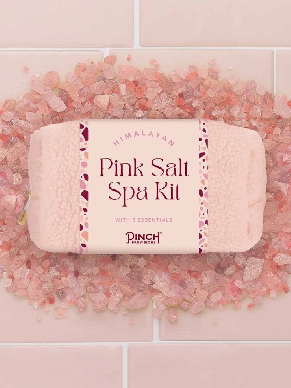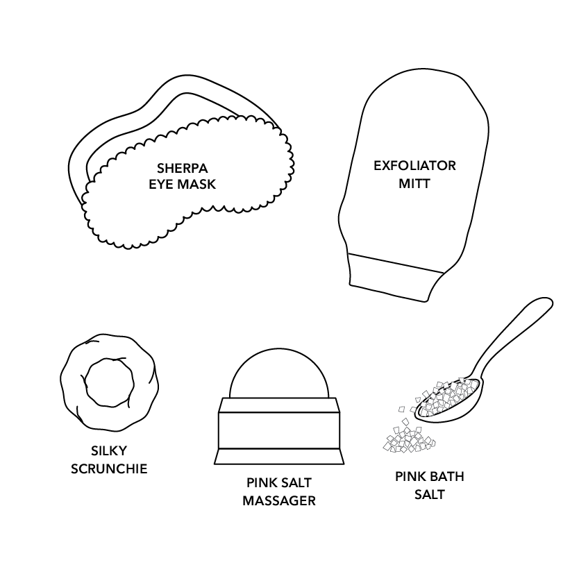 Just say spaaaaah with our new Himalayan Pink Salt Spa Kit, packaged in a blush sherpa dopp bag. Kit contains 5 spa-alicious essentials: sherpa sleep mask, Himalayan pink bath salts, silky scrunchie, exfoliating mitt and pink salt massager.